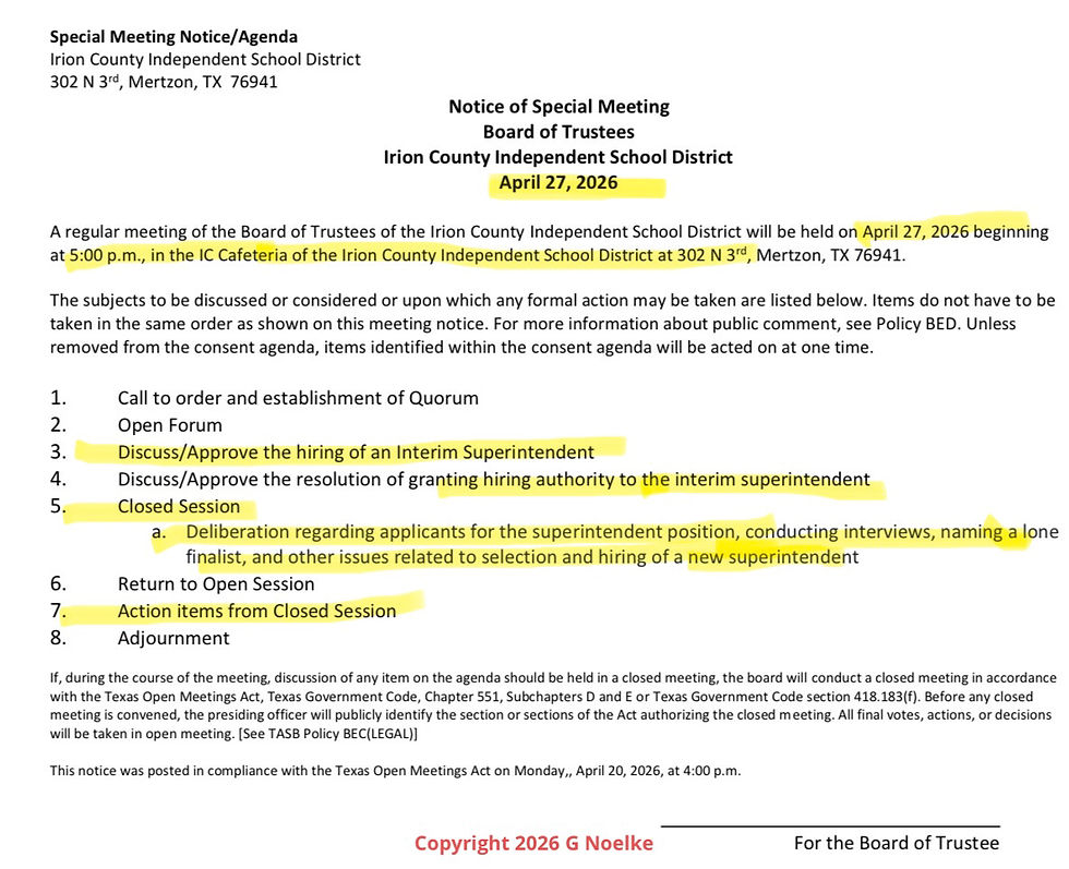Closed session and action from closed session, items 5 and 7: This is the identical language for each of the previous meetings during the process of hiring a superintendent. I know from attending the open part of the meetings once the Board began the process that they want to hire in April for a starting date 21 days later in May. If so, maybe this is the meeting the Board names its lone finalist. At the time of this posting, however, the Board is still conducting interviews. So, if none of the candidates were to their liking, this agenda is written broadly enough that they could continue to interview.